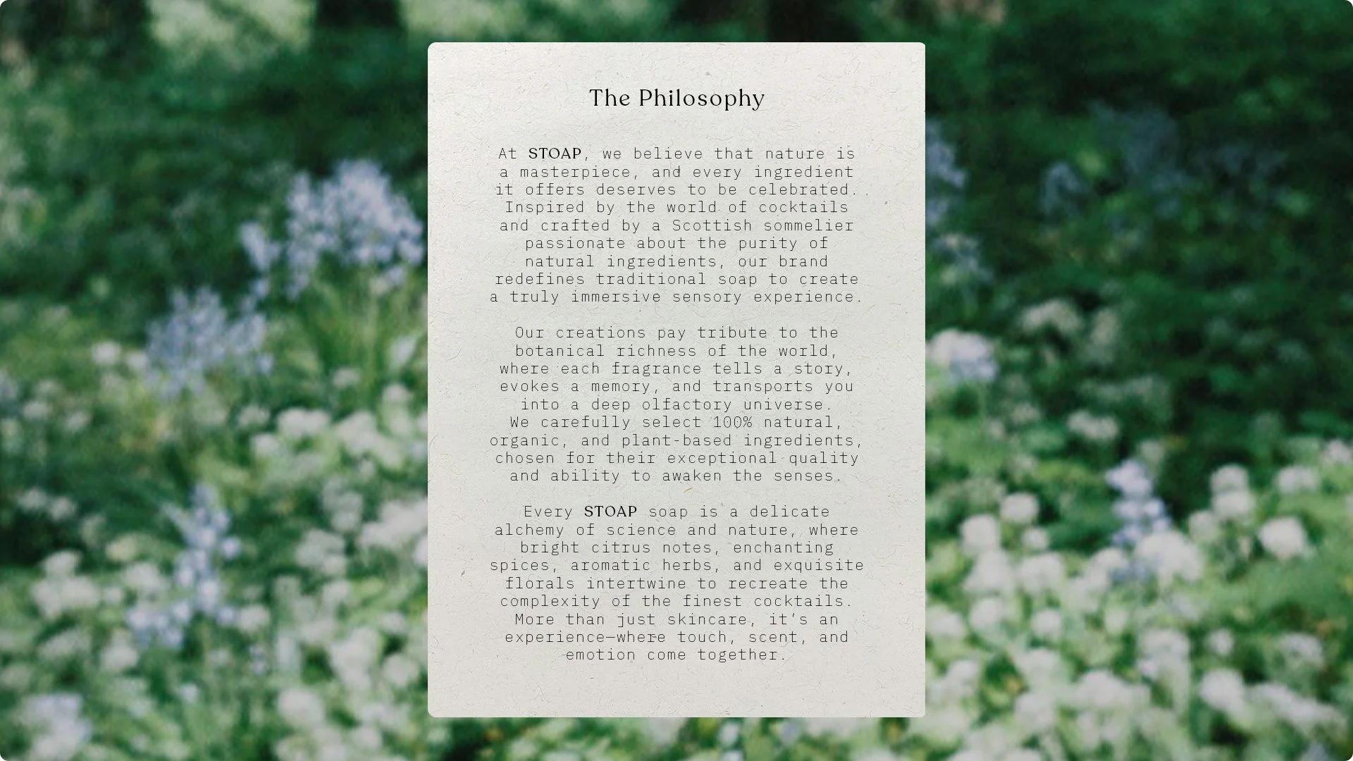 STOAP is a soap brand inspired by the refined ingredients of cocktails, offering a unique sensory experience. Fusing traditional purity with bold, unexpected botanical notes, each product is carefully crafted to elevate daily rituals into moments of elegance and pleasure.